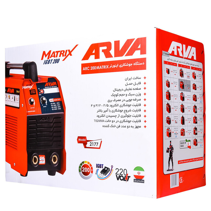 دستگاه جوش آروا مدل 2177 حداکثر جریان خروجی آن ۲۰۰ آمپر است و با قابلیت جوشکاری با الکترود 2/5 ، 3/2 ، 4 و جوشکاری با آمپر بالاتر را دارد، جوشکاری را در دو حالت TIG/MMA انجام میدهد دارای وزن سبک که باعث حمل آسان این دستگاه میشود، همچنین مجهز به دو عدد فن خنک کننده در پشت دستگاه که جلوگیری میکند از بیش از حد گرم شدن برد اصلی اینورتر و مجهز به قطع کن حرارتی است. دارای خاصیت anti stick یا ضد چسبندگی میباشد، صفحه نمایش دیجیتال آمپر متر جهت تنظیم آمپر خروجی و با داشتن دو ولوم برای تنظیم شدت جریان این دستگاه است.