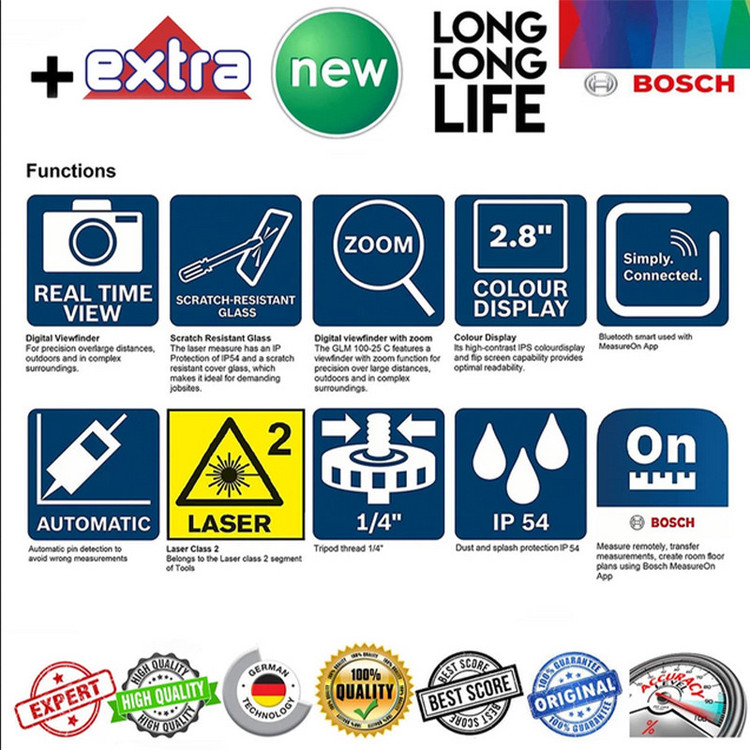 شاید بسیاری از مردم در دنیا کمپانی بوش را برترین برند در زمینه تولید لوازم خانگی و ابزار آلات صنعتی بدانند . ولی واقعیت این است که این شرکت در بیشتر زمینه های تولیدات صنایع پزشکی نفت و گاز و بسیاری از صنایع با نام های تجاری دیگر جز برترین ها بوده است . یکی دیگر از زمینه های طراحی و تولیدی این شرکت در زمینه ابزار دقیق متر ها و تراز های لیزری است که می توان گفت در این راه هم بوش بی رقیب بوده است. شرکت بوش با تولید متر 150 متری دوربین دار بوش مدل GLM 150-27 C در اواسط سال 2022 میلادی قدرت خود را در تولید ابزار دقیق بر رخ رقیبان بزرگ کشید . محصولی که به جرات می توان گفت تاکنون در تمام دنیا بی رقیب بوده است . اندازه گیری لیزر حرفه ای با دوربین یکپارچه و وضوح بالا و نمایشگر ال سی دی پیشرفته کار را با این متر برای شما لذت بخش میکند یکی دیگر از ویژگی های این متر استفاده از دوربین 5 مگاپیکسلی واقعی است که به عنوان منظره یاب برای یافتن و بزرگنمایی اهداف ، و رفع مشکلات بصری مربوط به روشنایی به خصوص در محیط باز و زیر نور خورشید ، مسافت طولانی ، محیط پیرامون پیچیده و سایر عوامل غلبه می کند . صفحه نمایش ای سی دی رنگی بزرگ دستگاه (2.8 اینچ) ، ظاهری آشنا با اسمارتفون دارد. قابلیت خواندن از همه زوایا به لطف فناوری IPS امکان پذیر است ، در حالی که پیوند نوری تأثیر تراکم یا تابش نور خورشید را هنگام مشاهده صفحه در فضای باز به حداقل می رساند. این دوربین با بزرگنمایی سه مرحله ای کار می کند ، حداکثر 700 تصویر را ذخیره می کند و 50 تصویر آخر را به همراه مقادیر اندازه گیری شده در صفحه نشان می دهد. این بدان معنی است که می توان هر اندازه گیری فردی را اختصاص داد. امکان کنترل این اندازه گیری لیزری از راه دور از طریق تلفن هوشمند یا رایانه لوحی ، از طیف وسیعی حدود 10 متر ، نیاز به کمک شخص دوم را از بین می برد. یک عملکرد تایمر راحتی بیشتری را اضافه می کند. از بزرگترین ویژگی های این متر قابلیت اتصال به گوشی همراه و کامپیوتر است به نحوی که با نصب اپلیکیشن این متر بر روی گوشی همراه ( نصب اپلیکیشن بر روی سیستم اندروید یا Ios ) یا نرم افزار مربوط روی کامپیوتر می توان از ویژگی های مثبت این متر استفاده کرد. با تمام ویژگی های مثبت و فنی این متر لیزری میتوان گفت این دستگاه در نوع خود در دنیا بی رقیب می باشد.